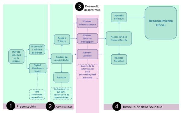 Una vez que la solicitud es recibida por el equipo de RO de nivel regional, pasará por una etapa de “Admisibilidad” en donde se realiza una primera revisión general con la finalidad de evaluar si la documentación mínima solicitud cumple con la documentación mínima requerida. De existir alguna observación, esta será notificada al sostenedor, quien tendrá un plazo de 5 días para subsanar las observaciones o adjunte la documentación faltante, con indicación de que si así no lo hiciere se tendrá por no presentada dicha solicitud.